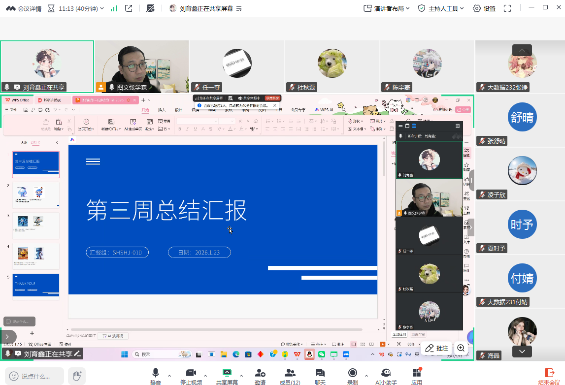 1月23日下午,SHSHJ-010组在腾讯会议平台召开2025-2026学年社会实践学期第三次社会实践阶段总结会,由指导教师张学森主持,小组全体12名成员参加。