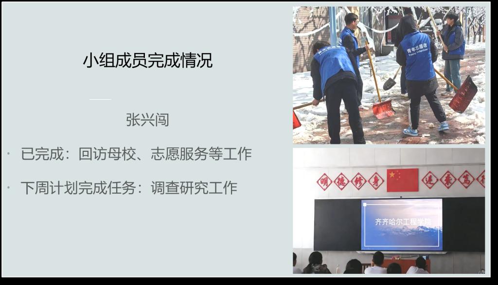 本次会议核心议程聚焦社会实践第三周任务推进情况,由各小组代表以PPT形式进行汇报。本周,各小组积极投身丰富多彩的社会实践活动,汇报过程中,代表们图文并茂、生动详实地展示了本组在志愿服务、社会调研、“青春FUN肆拍”等多个维度的实践成果,充分展现了同学们的参与热情与实干精神。通过本次分享交流,各组相互借鉴优秀经验、汲取实践智慧,为后续高效推进各项任务、提升实践质量积累了宝贵经验,也为接下来的实践工作筑牢了基础。