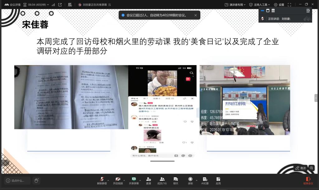2026年1月30日晚,指导教师郭伟伟召开社会实践学期第四周指导会议,会议通过腾讯会议线上召开。