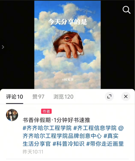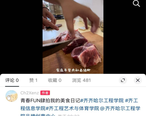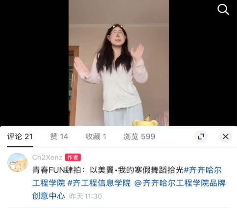 随后,小组各成员分工协作、同步推进各项核心项目,动态成效突出、亮点纷呈。在青春FUN肆拍任务中,陈卓、陈思彤结合自身特长独立开展创意创作,用镜头传递生活热爱与青春态度:组长陈卓双线并行,一方面记录卤猪蹄、家庭午餐肉制作的烟火日常,定格平凡生活中的温暖;另一方面捕捉舞蹈练习的热血瞬间,展现青春的活力与坚持;陈思彤聚焦《正是橙黄橘绿时》书籍主题,用精炼话语提炼“平凡日子亦有诗意”的核心内涵,搭配生动镜头传递阅读温度,让观者在1分钟光影里,感受书籍与生活碰撞的治愈力量,二人以不同赛道诠释青春多元魅力。在寻新“荐”面礼(回访母校)项目中,陈卓、陈思彤共同返回高中母校,通过主题分享、面对面交流等形式,向学弟学妹详细介绍齐齐哈尔工程学院的办学特色、校园文化,分享大学专业学习心得,耐心解答升学选择、专业认知等疑问;同时现场播放校园文化主题视频,以鲜活直观的方式传递学校“亮剑”精神、劳动价值与青春正能量,既搭建了校际交流的坚实桥梁,也在互动中提升了自身语言表达与逻辑梳理能力。在志愿服务方面,郭汝佳立足专业所长,前往萍乡市太坪村村委会开展公益服务,协助村民整理信息数据、优化数据统计表格,为村委会便民服务工作提供精准技术支持,在贴心服务中践行社会责任,深化了对专业价值与社会需求的认知,锤炼了耐心细致的工作作风与沟通协作能力。