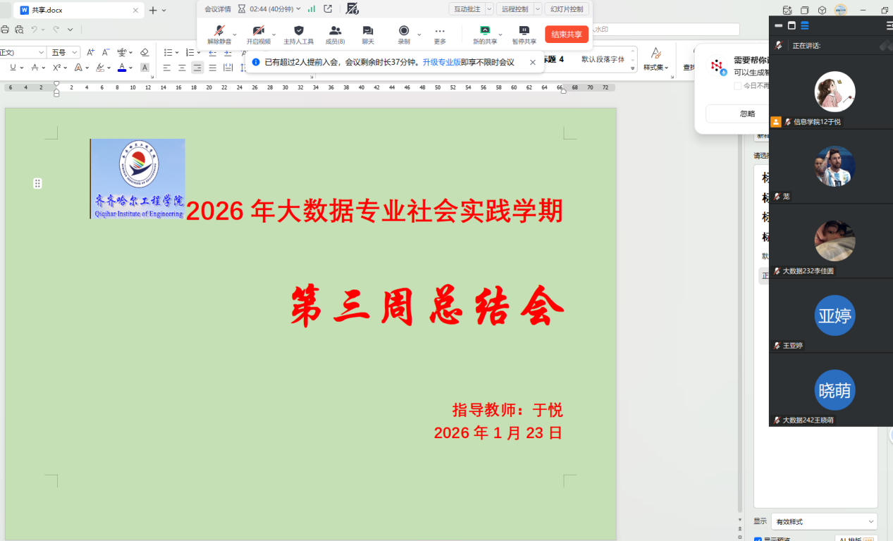 1月23日,信息学院指导教师于悦组织召开社会实践学期第三周指导会议。来自各实践小组的19名学生代表悉数参会,共同总结实践进展、探讨解决问题。