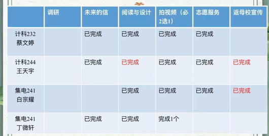 最后,组长蔡文婷对本次第五周组内任务汇报会进行汇总总结,充分肯定了王天宇与白宗耀在返母校宣传任务中的积极表现与扎实成效,同时提醒全体组员,后续需重点关注实践任务成果的打磨与优化,查漏补缺、精益求精,确保各项社会实践任务高质量完成,推动实践工作有序衔接。