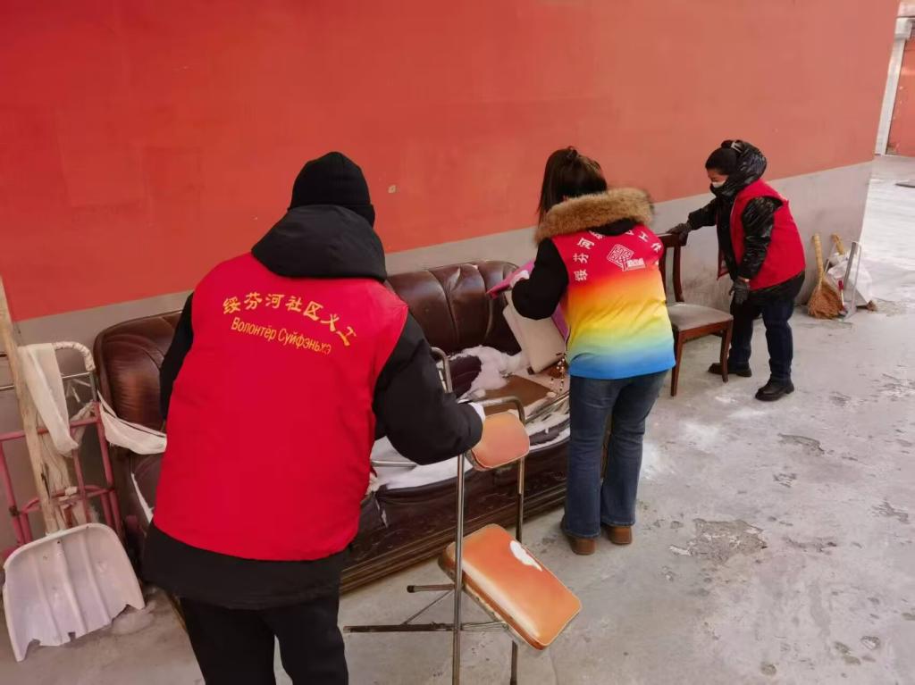 1月15日,在绥芬河市新华社区,电商241班的朱畅同学身穿“绥芬河社区义工”马甲,和伙伴们一起清理公共区域、整理废旧家具,为改善社区环境贡献力量。她的出色表现,也获得了社区颁发的“社会实践活动优秀”荣誉证书。