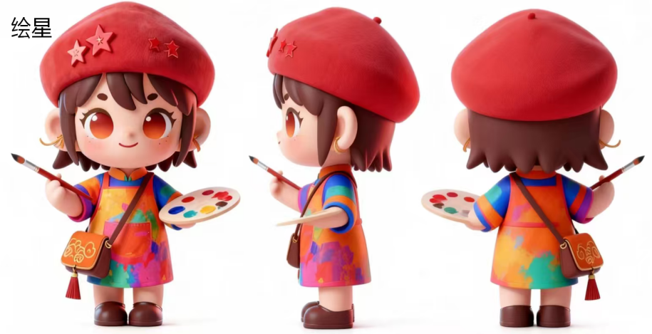 视觉231李顺达以视觉传达专业的创作者为原型,头戴红星贝雷帽,手持画笔与调色盘,身着斑斓彩衣,展现专业特色与学子们以笔为媒、绘就精彩未来的创意活力。