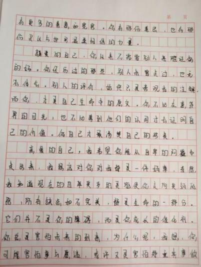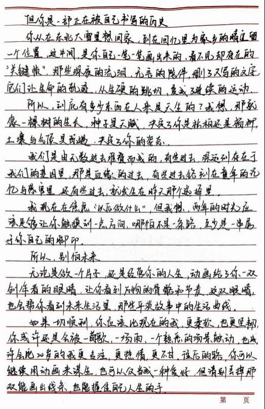 动画251姚思彤《致亲爱的我》书信笔触细腻温柔,满含自我对话的坦诚与勇气。信中坦陈过往的被动不安、迷茫焦虑,以及对他人评价的过度依赖,也记录了逐步找到人生方向、学会拒绝与自愈的成长轨迹。强调内心敏感与共情力是天赐的能力,鼓励未来的自己走出自卑,接纳不完美,将缺点化为成长的养分。面对未来的不确定性与潜在挑战,传递出“鼓起勇气直面障碍”的信念,坚信历经磨砺后会变得更强大,文字真挚动人,满是自我接纳与对未来的期许。