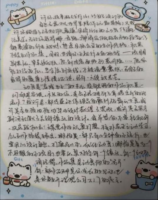 在各班级的精心组织下,学生们认真投入书信创作。动画241肖迪《一封河流笔记》,字里行间满是对成长与未来的深度思考。信中回顾了大二求学的中间状态,提及东北求学的思乡情愫、团队合作的磨合与收获,将动画创作中 “赋予无生命之物灵魂” 的体验娓娓道来。以树木生长为喻,探讨天性与过往经历对人生的塑造,鼓励未来的自己以动画赋予的“敏锐眼光”直面未知,坚守热爱与行动力,既憧憬职业发展,也珍视成长路上的每一步脚印,文字兼具真挚情感与哲思。