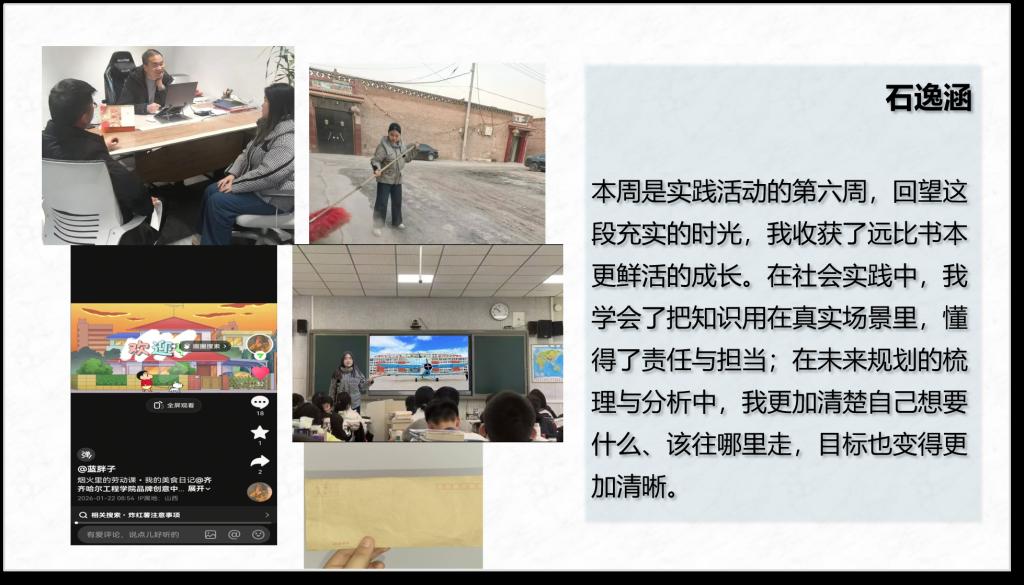 本次交流会采用双抽方式,确定各小组汇报顺序及汇报人。汇报过程中,各小组依托PPT展示载体,结合详实的图文资料,全面细致地分享了本组在志愿服务、社会调研等各类社会实践活动中的具体开展情况、阶段性成果与实践感悟,充分展现了全体成员积极参与、认真投入的实践态度。此次交流搭建了互学互鉴平台,各组在分享中汲取优秀实践经验。