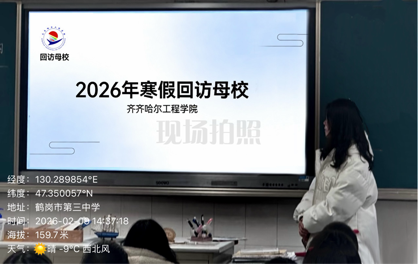 随后,组长李东岳率先开展实践,回访母校鹤岗市第三中学,通过主题分享、现场交流等形式,向学弟学妹详细介绍大学专业特色与自身学习经验,耐心解答学弟学妹关于升学、专业选择的疑问,助力母校学子做好升学规划。