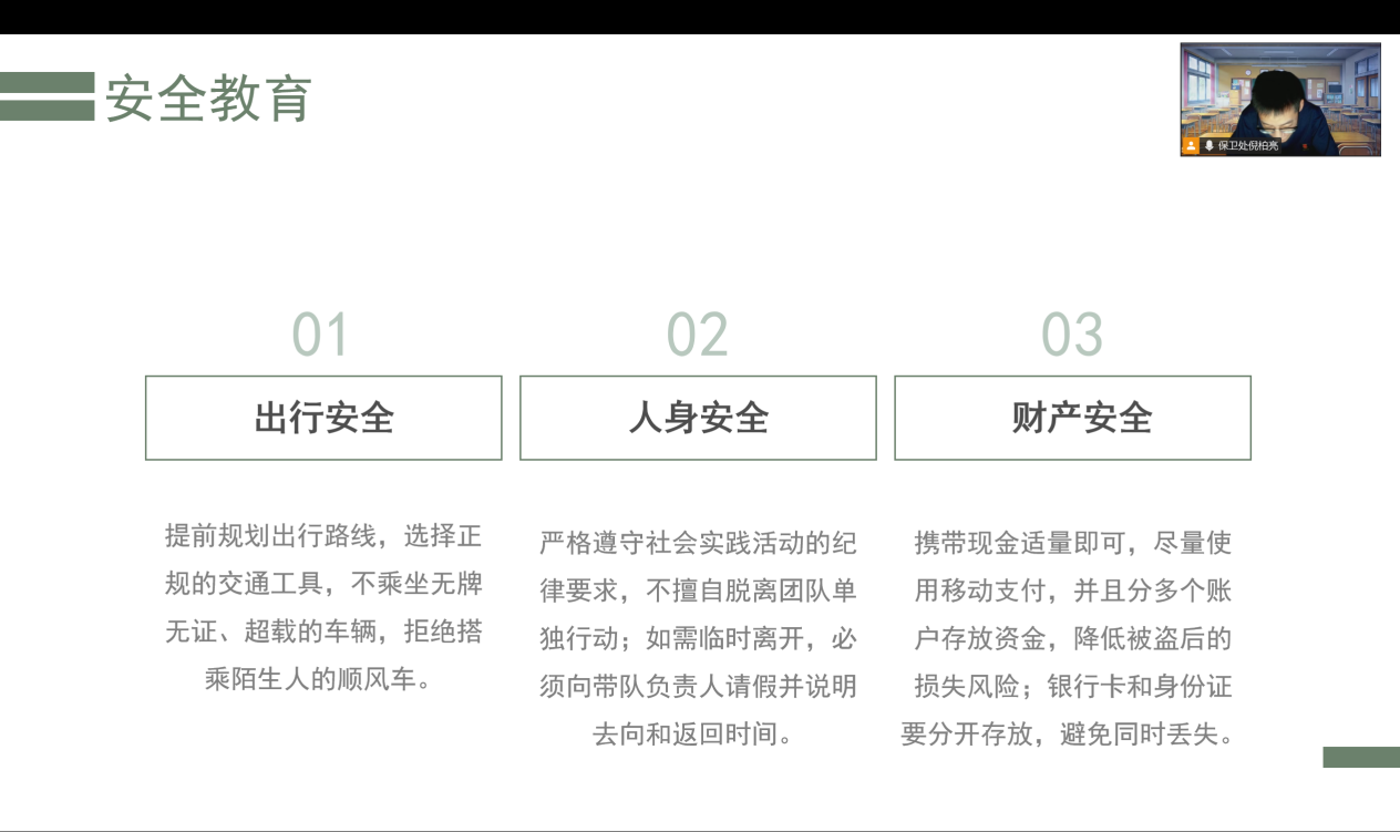 会议伊始,倪柏亮观看了学生汇报,本小组就出行安全、人身安全和财产安全进行简短总结。倪柏亮指出,实践首周亦是团队的磨合期。面对陌生环境、沟通障碍及工作挑战,队员们通过例会及时分享见闻、调整策略,在协作中增进了理解与默契。