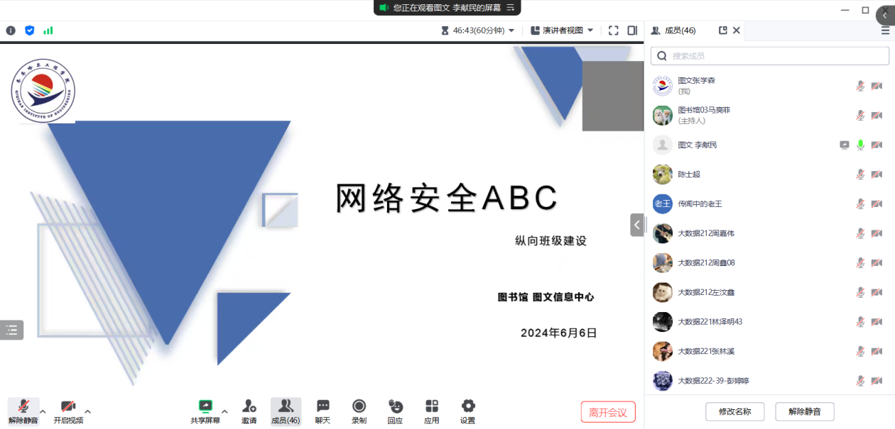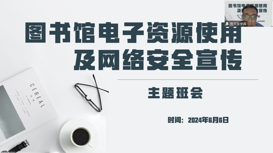2024年6月6日晚七点三十分,生涯导师马爽菲、李献民、张学森联合召开名为《图书馆电子资源使用及网络安全宣传》的线上会议,参会人员为三位老师所带的学生。会议由张学森老师主持。