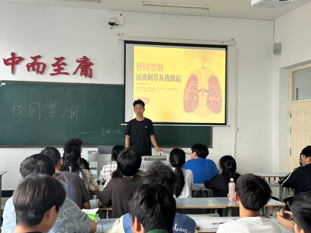 5月28日,计科232班在1号教学区1#1311多媒体教室开展“校园禁烟”主题班会,由计科232班班长王中旭主持,计科232班50人参加。