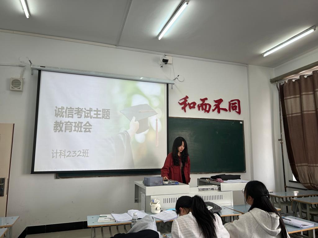 5月14日上午,计科232班在一号教学区1#1402多媒体教室开展诚信考试班会,又计科232班徐雯雯主持会议,计科232班51人参加。
