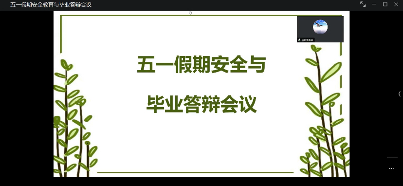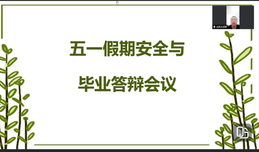 通过本次班会,各位同学对五一假期安全出行有了高效安全意识,同时也让同学们明白学术不端的严重性,给予同学们警告,有效的加强了学风建设、学术规范以及预防学术不端。