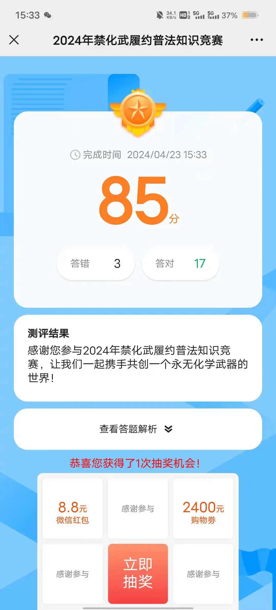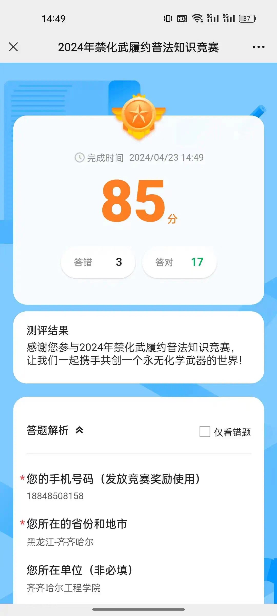 为深入贯彻党的二十大精神,广泛宣传《禁止化学武器公约》履约工作的重要意义和丰硕成果,提高全校师生对履约工作的认知度,积极响应校团委的号召,进一步加强禁化武履约普法教育,提高学生的法律意识和法治素养,信息工程系于4月1日到4月26日开展了禁化武履约普法知识竞赛活动,全系共872名同学参加。