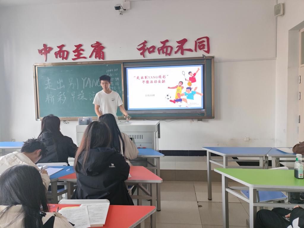 首先,刘展瑞同学向同学们普及了早操安排活动的好处。早操安排能够提升同学们的身体素质,增强免疫力,培养健康习惯, 提高精神状态,培养纪律性……随后,刘展瑞同学提醒大家按时出勤,迟到三次记为旷课一次,同学们积极响应,纷纷表示将自觉遵守时间规定。最后,刘展瑞同学再次强调不要迟到,他谈到:“让我们一起走出别yang精彩。”