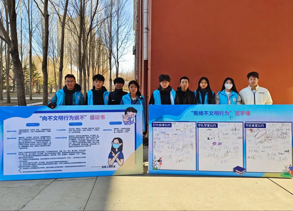 本次活动为呼吁同学们向不文明行为说不,共建美好校园。首先,信息工程系团总支工作人员在活动现场准备笔和倡议书,向参加活动的同学介绍活动流程。随后,同学们阅读倡议书内容,在阅读倡议书时,纷纷表示:原来平常生活中有许多没有注意到的小事都会对别人造成困扰,以后一定会多加注意的,从我做起,杜绝一切不文明行为。最后,同学们合影签名,全体工作人员合影留念,活动结束。