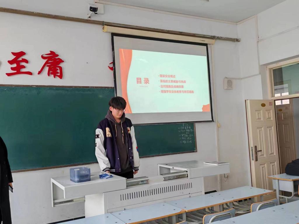 首先,本次班会的目的是为了保障学生的安全、促进学生健康发展、培养责任感和社会适应能力,同时营造安全文化,为学生的全面发展和校园的和谐稳定提供支持和保障。会上裴国丰同学讲述了国家安全教育的意义,提高了学生们的国防意识。接着,裴国丰同学为同学们播放了国家安全教育的相关影片,片中的爱国人士无不使人感慨万千,同学们受到了深深的鼓舞,相信同学们也定会在未来之路上奉献自己,为融入社会走进来,为服务社会走出去。