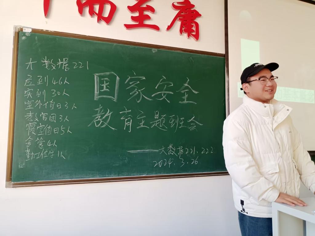 3月26日早上,大数据221于1#1308开展国家安全教育主题班会,全班46名同学,班会由学委效永康主持开展。