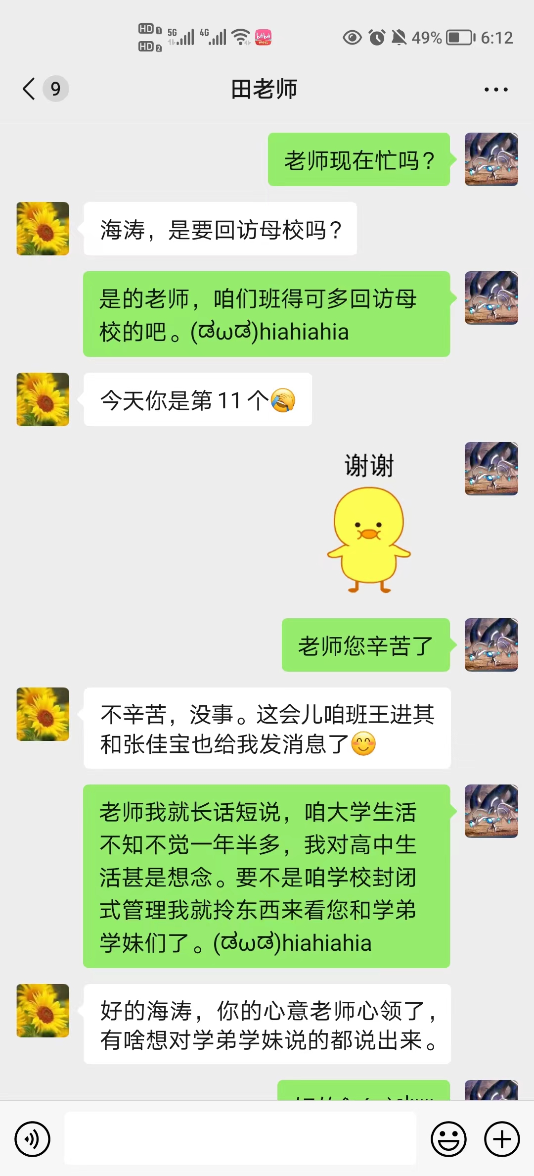本次回访母校活动,信息工程系计科223班学生陈海涛在假期拜访了高中三年的班主任,汇报了近年来的学习情况,想到高中三年的时光飞逝,心中充满了感慨。