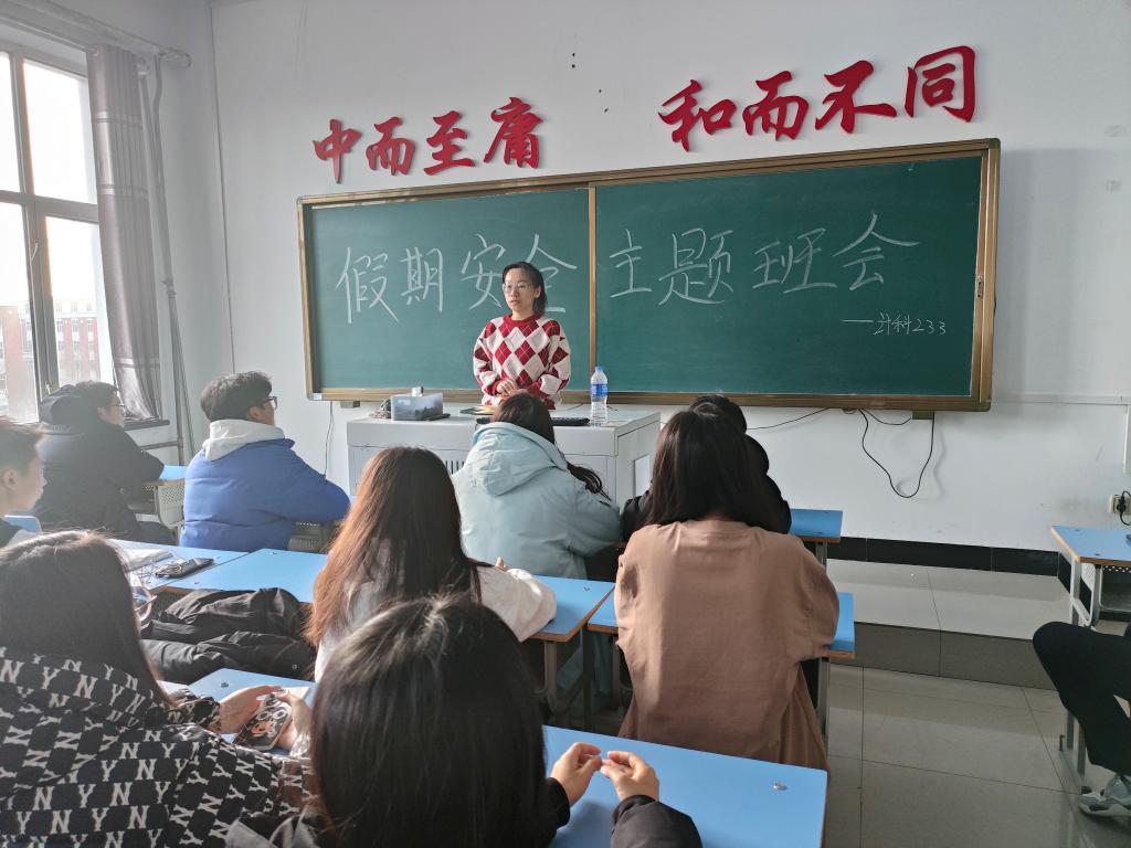 首先,辅导员杨佳佳说:“生命诚可贵、安全价更高。即将迎来了寒假,同学们回家的过程中以及假期出行都要注意安全。我宣布此次假期安全主题班会正式开始。”辅导员杨佳佳讲解了假期安全的重要性,让同学们对假期安全出行有了更加深刻的认识。随后,辅导员杨佳佳讲到了假期安全包括交通安全,饮食安全,防火安全,溺水安全。她为同学们列举了一些假期危险案例并讲解了每一个安全的注意事项。最后,辅导员杨佳佳总结了假期安全注意事项。她说:“关注安全点点滴滴不马虎,珍爱生命分分秒秒保平安。希望我们每个同学都能在寒假期间牢记安全知识,安全出行。最后祝愿大家拥有一个愉快的寒假。”