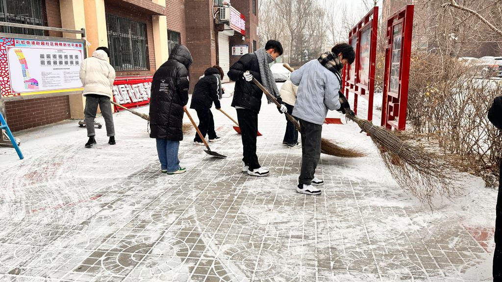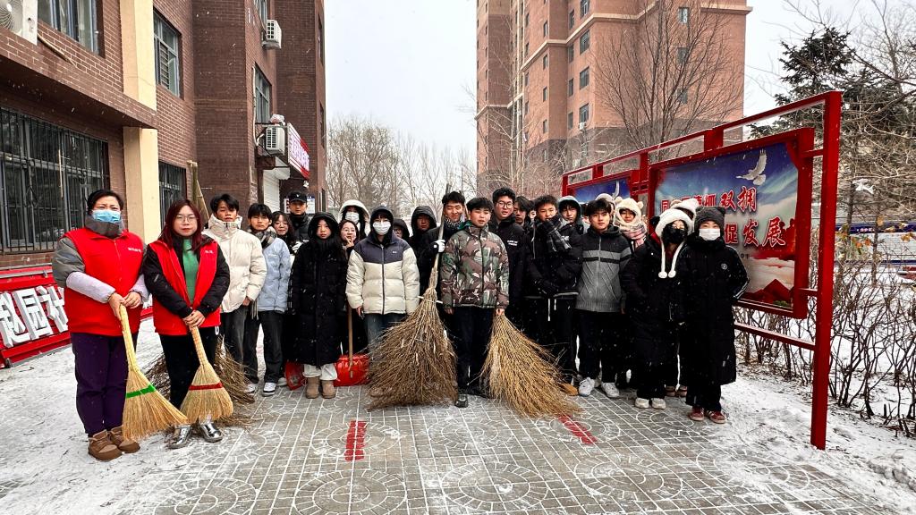 11月27日上午 ,大数据231班开展了社区志愿扫雪活动,志愿者们向龙沙区彩虹赵园社区进行志愿扫雪,由青工委员孙一林组织,共有30名志愿者参加。