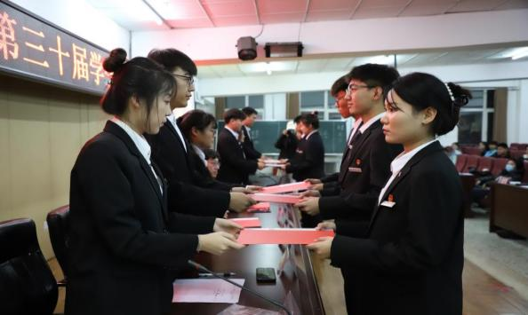 新一届学生会干部与第二十九届学生会干部进行交接仪式,党总支副书记孙晓芳为第三十届学生会干部颁发聘书。