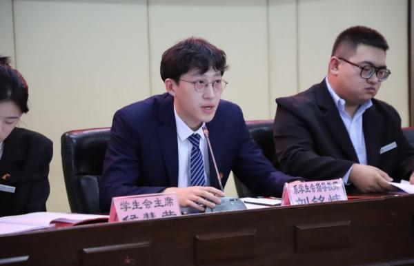 第二十九届学生会主席团成员王一鸣致开幕词并宣读《第二十九届学生会工作报告》,努力实现全心全意为同学服务的根本任务,“求真,务实,开拓,创新”,将我系的学生工作做“小”,做“细”,为同学服务,为老师分忧。
