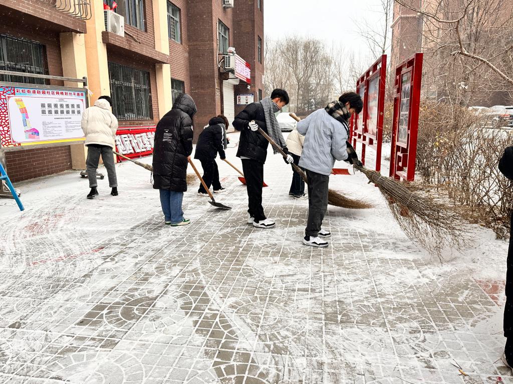 11月16日下午 ,大数据231班开展了社区志愿扫雪活动,志愿者们向通航社区彩虹街道党群服务中心进行志愿扫雪活动,由青红委员孙一林组织,共有15名志愿者参加。