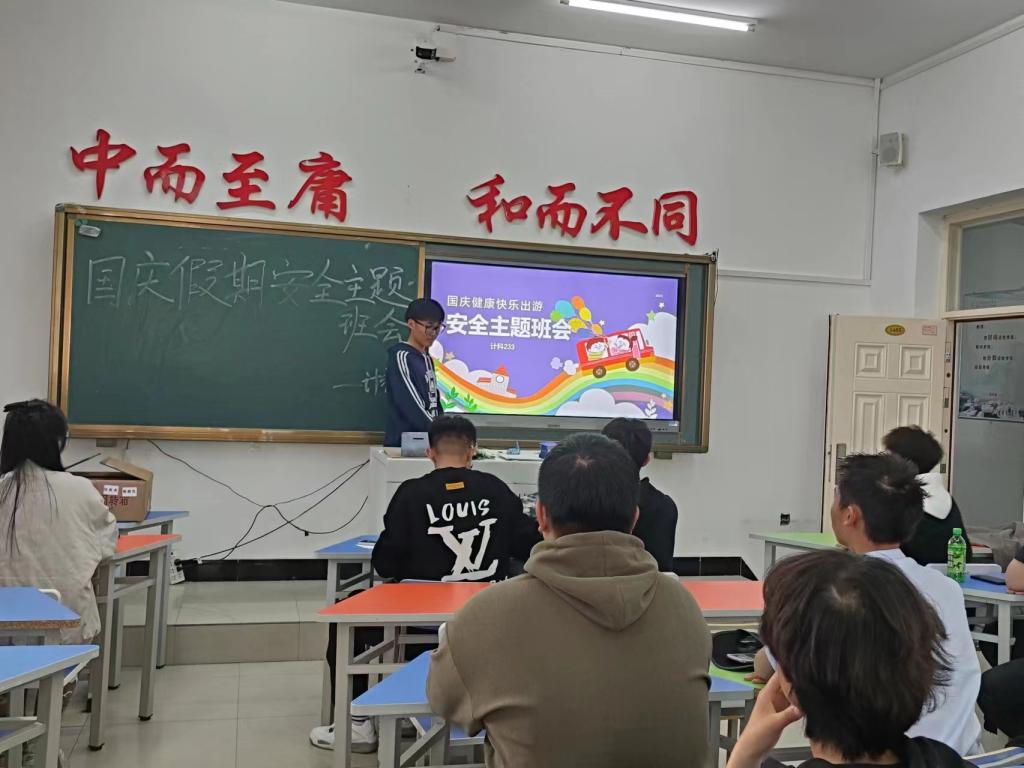 2023 年 9月27日下午四点,计科 233 班在一教 a 区 1405举办了国庆安全教育主题班会。由计科 233 班班长武梦琳主持,团支书赵芷曼辅持。此次班会的目的是为了科普国庆安全教育知识,共四十八人参加。