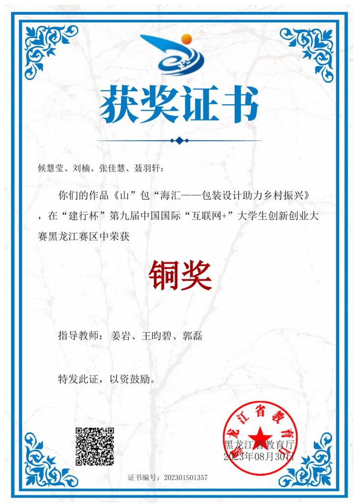 功夫不负有心人,在姜岩、王昀碧、郭磊三位老师们的细心指导下,《山“包”海汇》项目获得了“建行杯”第九届中国国际“互联网+”大学生创新创业大赛黑龙江赛区铜奖,同时所申报的创新训练项目《山“包”海汇》获得了国家级一级项目立项。