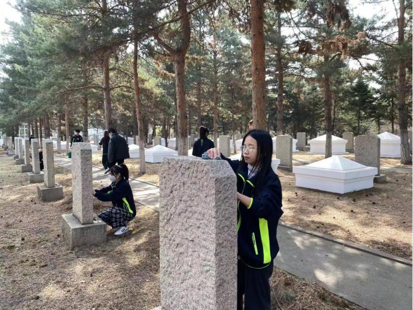 首先,在开展活动前,孙晓芳老师强调了纪律并讲解了今天的活动安排。然后,孙晓芳老师带领大家向烈士们集体默哀三分钟,深切悼念为了民族独立、人民解放和国家建设而牺牲的革命烈士,对革命先烈表达了自己最崇高的敬意和哀思。最后,大家用清洗干净的毛巾轻轻地擦去墓碑上的浮尘,主动清扫烈士墓碑周围的地面,捡拾垃圾。同学们以自身行动凝聚着对先烈的崇敬。