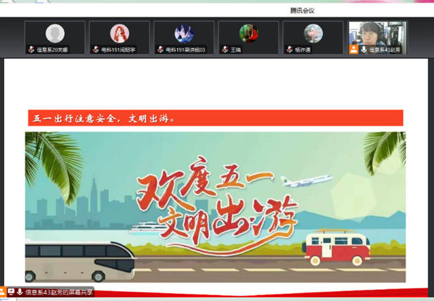 4月28日,电子科学与技术专业教师赵芳在线上召开五一假期安全教育主题班会。赵芳老师所负责的32名同学,参加了此次线上会议。