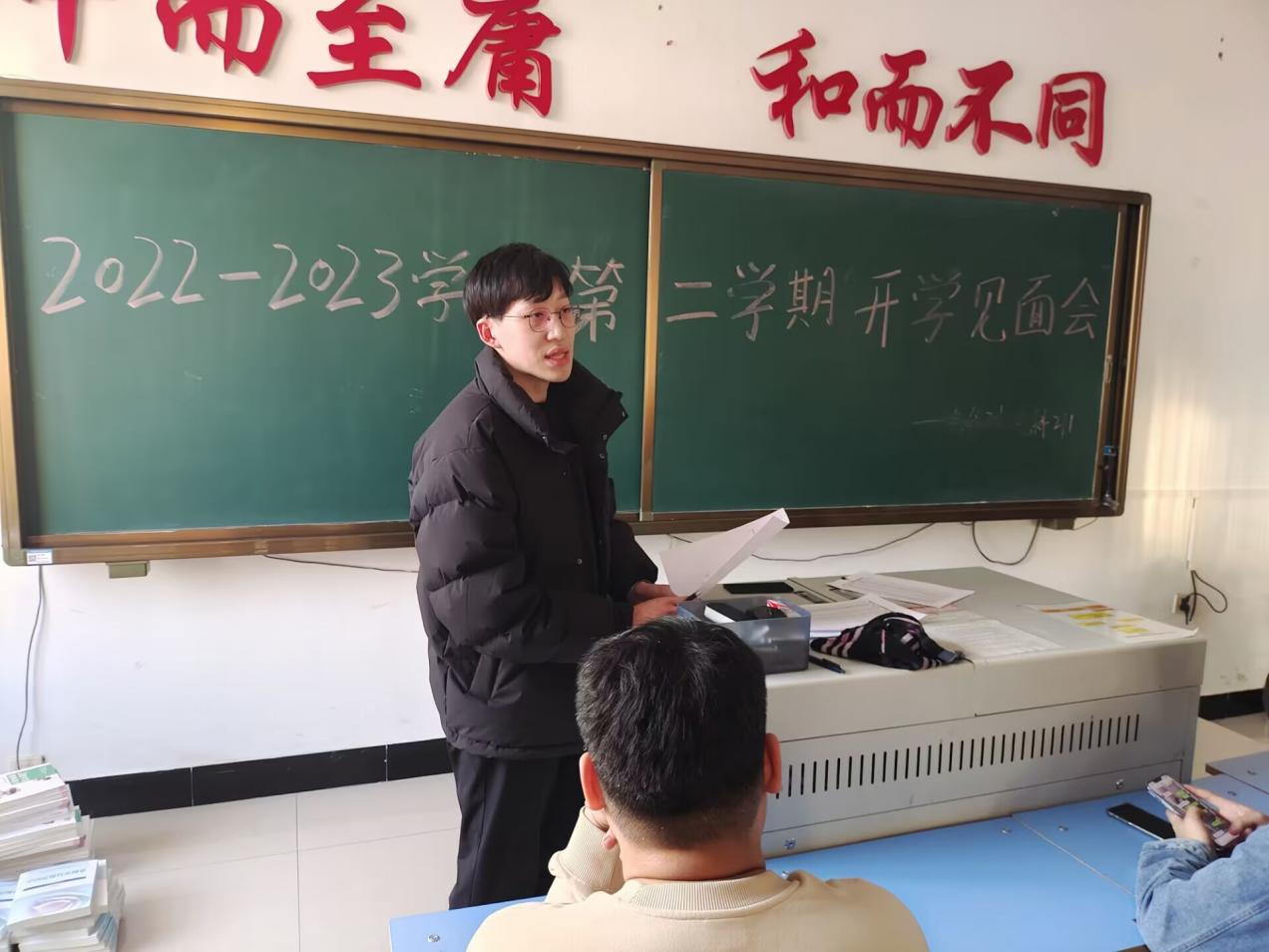 首先,刘铭炜老师说道:“同学们刚刚结束了第四学期的学习任务,也结束了假期生活,而这次会议的主要目的也是为了和同学们介绍一下开学的事宜。”刘铭炜老师开始介绍学校常态化管理的规定,自己新学期同学们的要面对的学校管理制度。随后,刘铭炜老师了解了同学们的第四学期活动开展情况:“第四学期也是咱们学校的老传统了,在放假期间同学们给我回传的实行活动的照片儿,我都看见,总体来说,咱们同学完成的非常不错,有一些问题也会向我及时提问,及时得到答案,这是一个非常良好的循环,而近期就会收取第四学期的材料,同学们要抓紧整理。”最后,刘铭炜老师询问大家的补考情况:“在上一学期的期末考试中,咱们大部分的同学都没有挂科情况,但少部分同学仍存在这一问题,而补考就在开学之后,同学们要抓紧时间复习,不要因为挂科影响到自己的学业。”