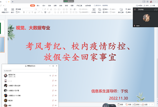 11月30日晚,生涯导于悦召集指导的全体同学,通过腾讯会议召开关于考风考纪、校内疫情防控以及放假安全回家的班会。视觉、大数据专业共29名同学参加。