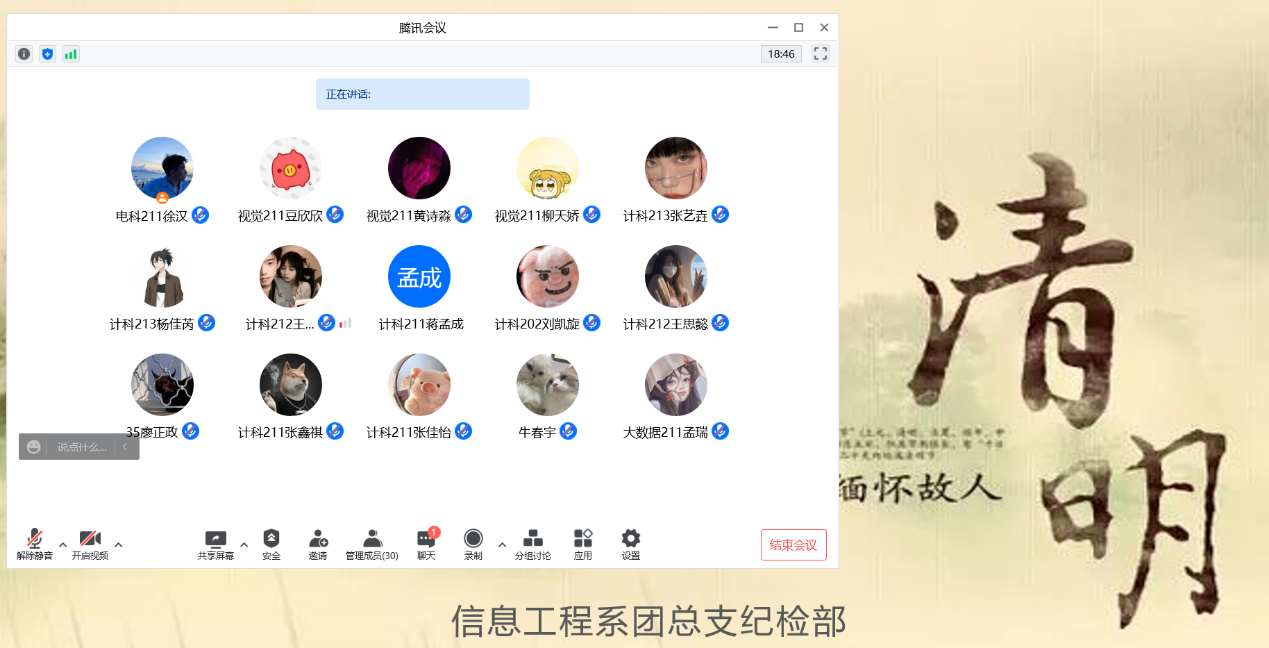 4月5日晚,信息工程系团总支纪检部在腾讯会议开展清明节观影特别主题日活动,本次观影活动共有30人参加。