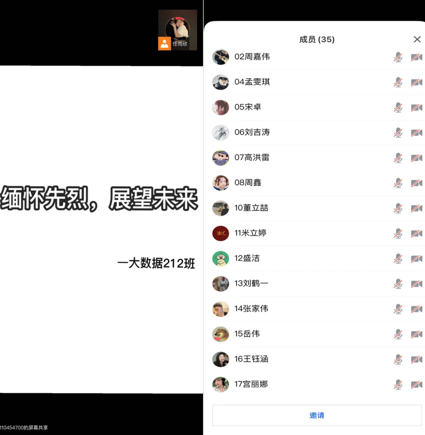 4月5日下午,大数据212班在腾讯会议线上开展“缅怀先烈,展望未来”主题团活。本次会议由大数据212班组织委员任雨欣主持,共35人参加。
