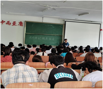 6月1日下午,辅导员任鹏飞在一教1101召开“考风考纪”主题教育班会,参加班会有电科201、动画201、视觉201、视觉202、视觉203全体同学。