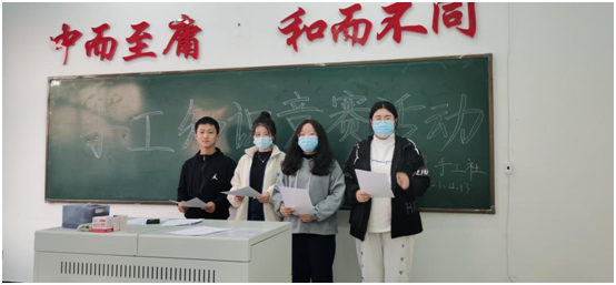 活动开始前,由社团干部通过微信、QQ等通讯软件进行宣传,学生们积极踊跃报名。当日活动开始,由社团干部冉莉涵发放知识竞赛的试题,试题中涵盖了大量有关手工的知识,有关中国结、剪纸、刺绣、布艺、陶艺、灯彩、风筝、皮影等等中华传统手工艺文化。随后,大家阅读完试题后开始认真答题,答题完毕后,由社团干部收齐,现场公布答案,进行评分,整个过程公平公开公正。通过评分,动画201班冉莉涵获得第一名,视觉201班艾欣彤获得第二名,电科201班杨磊和视觉203班杜青青获得第三名。