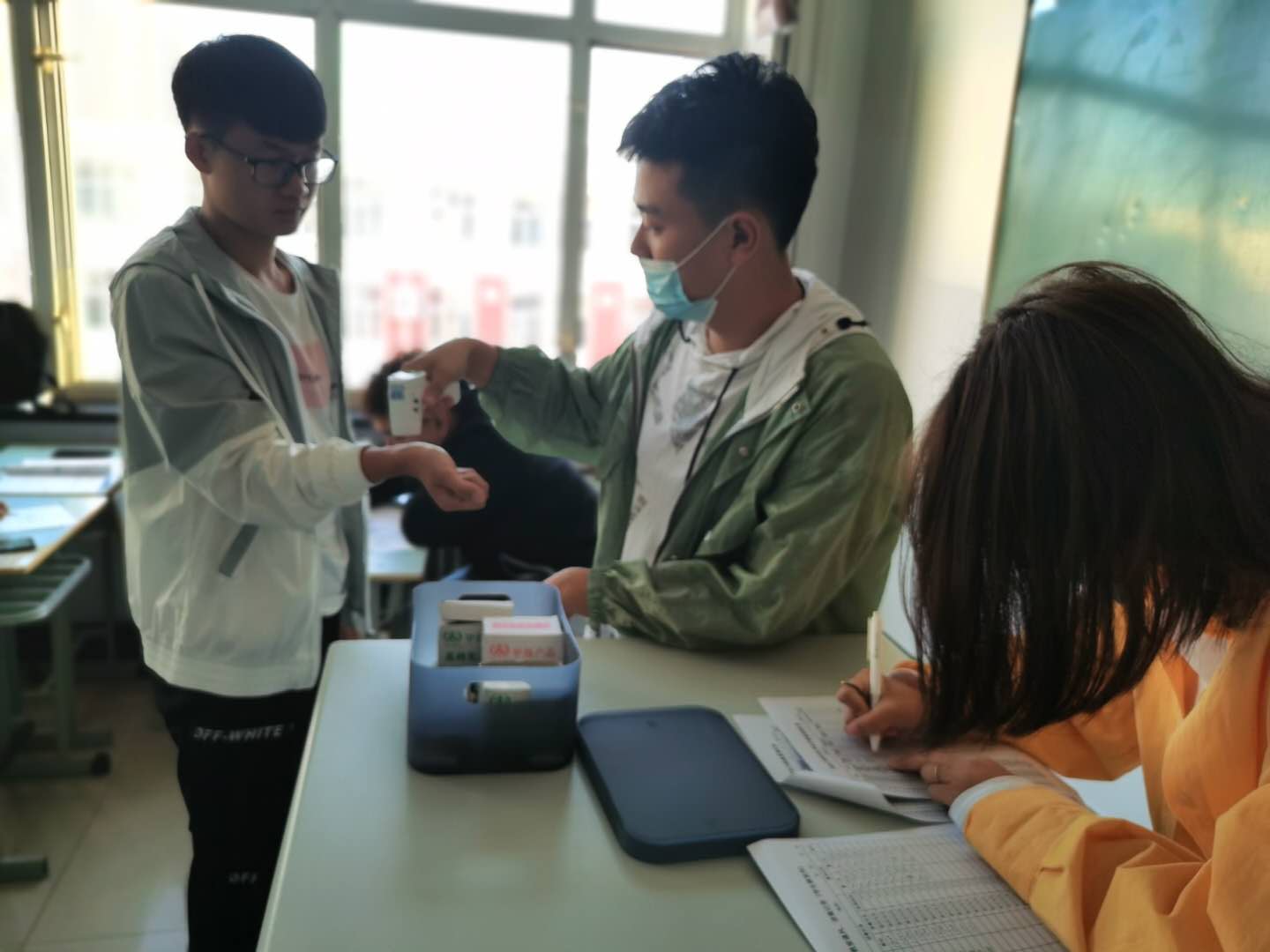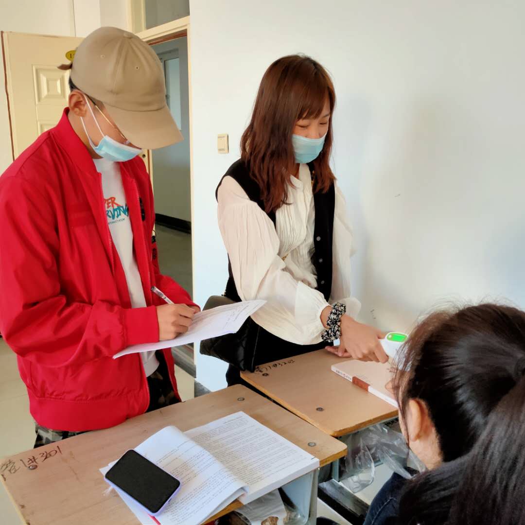 铃声响起,同学们陆陆续续步入教室。与此同时,信息工程系的团干部对信息工程系每个班级的每位同学逐一地进行体温检测,实行点名一人,测量一人的方针,并根据数据如实填写全系同学体温情况登记表,汇总后统一上报学校学生处,争取不漏检一人,对每位同学负责。