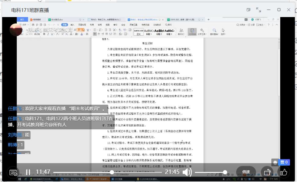 会议开始前任鹏飞老师亲切的问候了解同学们的健康状况和学习情况,并要求大家虽然临近期末同学们在家觉得不能放松,要做到学习健康两手抓。随后任老师分别为同学们介绍了“考生须知和考风考纪。最后任老师讲到一个学校的校风是和学生的学风密不可分的,诚实守信是当代大学生应具备的品质,这次考试坚决严惩作弊行为,给那些平日不好好学,考试投机取巧的同学们一个深刻的教训。