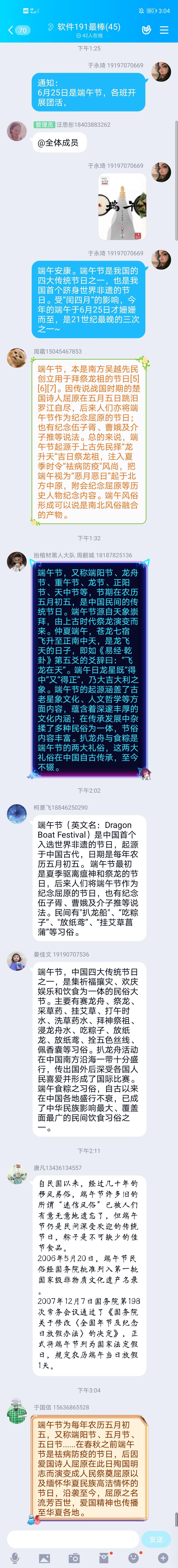 为弘扬中华传统节日,纪念爱国英雄屈原。2020年6月25日,软件191班全体成员在线上讨论。活动开始,由组织委员于永琦介绍有关端午节的内容,与本次活动的主题。