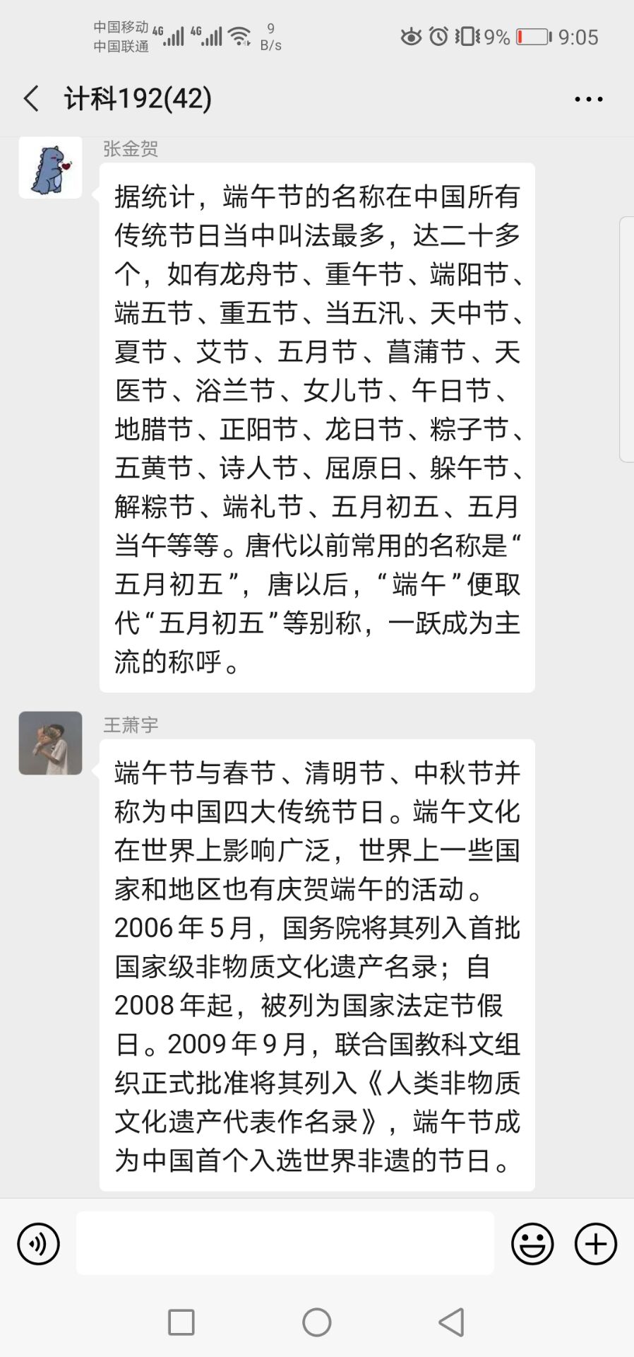 2020年6月25日,计科192班于微信平台开展“端午节”主题团活,此次团活由组织委员李嘉新主持,计科192班全体学生共同参与。