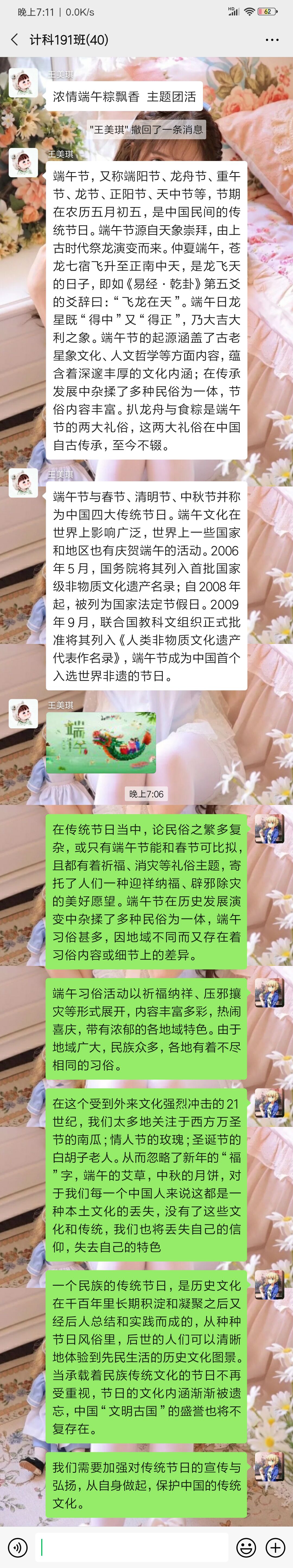 2020年6月25日计科191班由组织委员张宏宇组织召开端午节主题线上团活,计科191班全员参加。