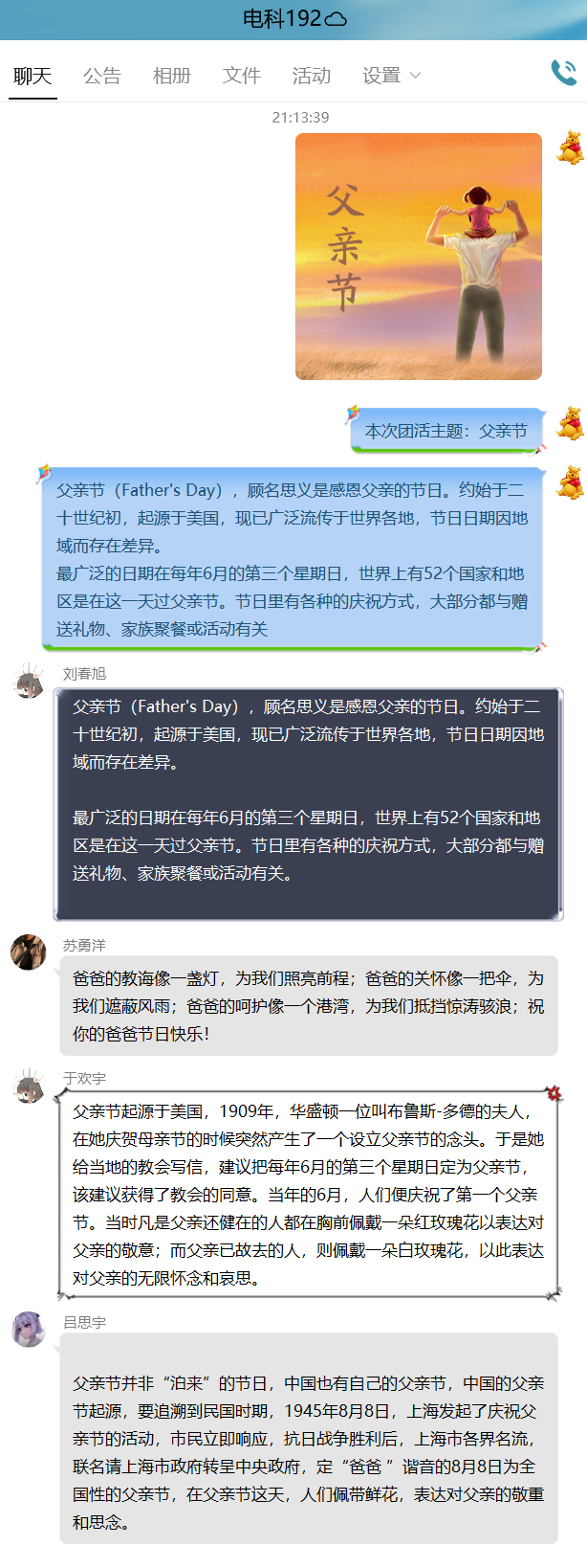 父爱如山,厚重且深沉,他可能很严厉,可能不善表达但是他是天底下最爱我们的对我们最好的人,为了让同学们更好的于父亲相处电科192班于2020年6月21日在QQ群开展“伟大的父亲”主题活动,此次活动由组织委员孙天泽主持。