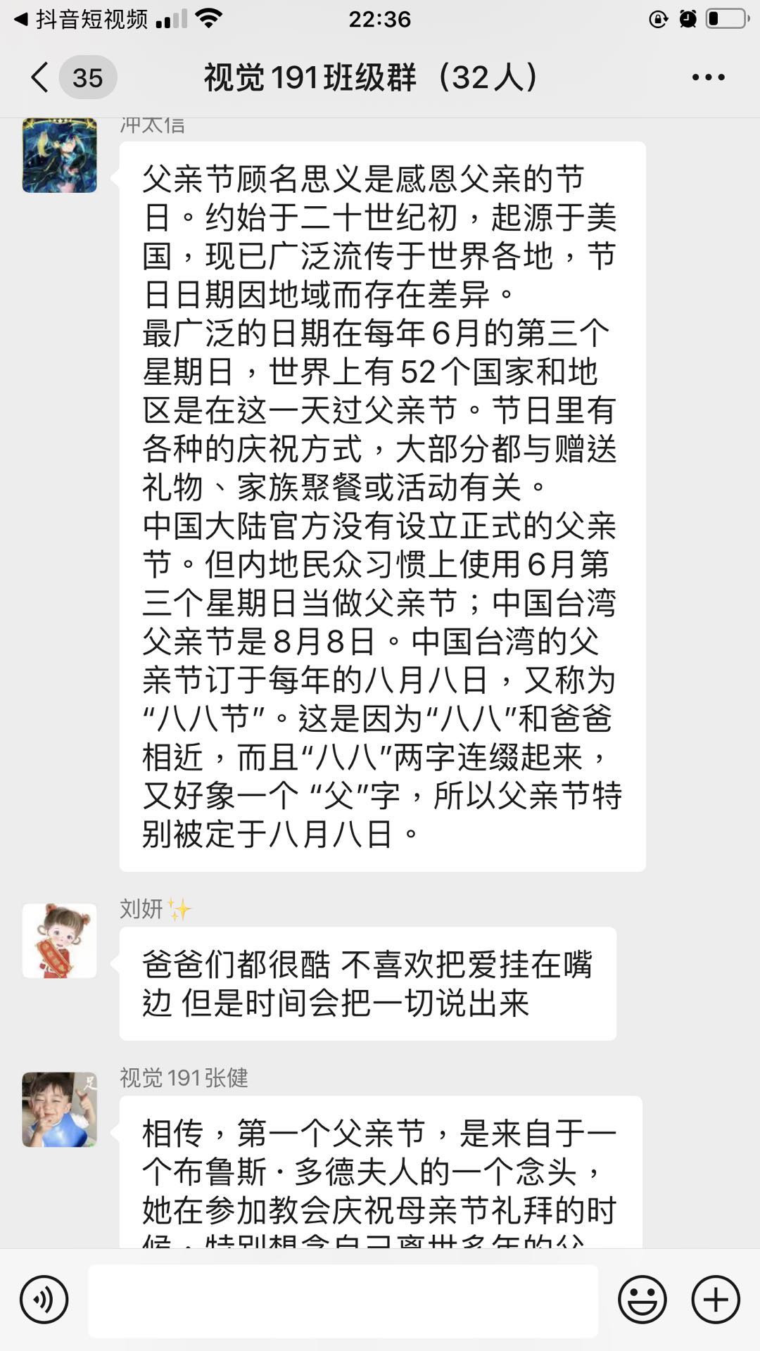 活动开始,宋昕睿同学首先向大家介绍了父亲节的由来、含义以及不同时代的不同形式,她说:“父亲节,是感恩父亲的节日,世界上有52个国家在这一天过父亲节。我们要在这一天分享大家怎样为自己的父亲过父亲节的,并且怎么表达费父亲的爱。”随后她组织大家在群里分享自己对父亲节的看法以及怎样给父亲过父亲节。