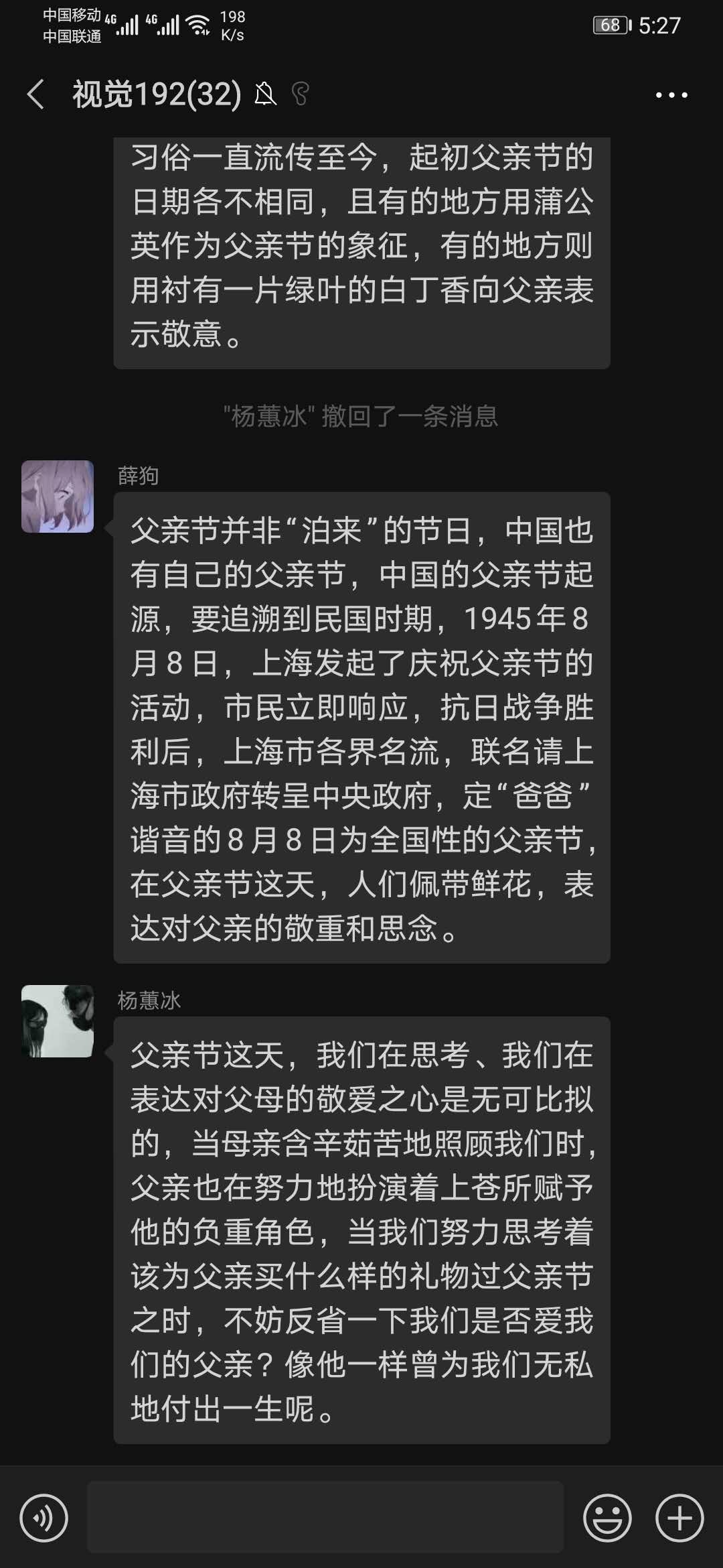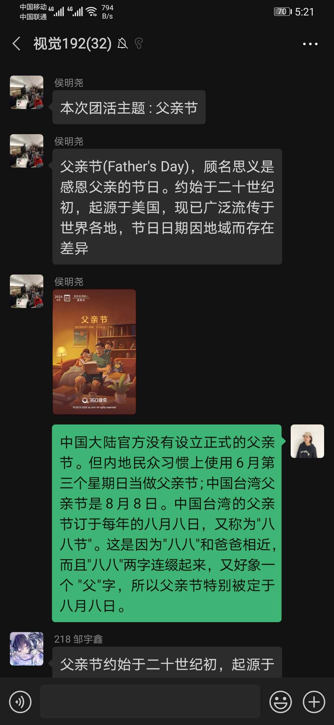 为了让同学们珍惜在家与父母相聚的时间,感恩理解父亲深沉的爱,视觉192班于2020年6月21日在班级微信群里开展了以父爱如山为主题的团活动。