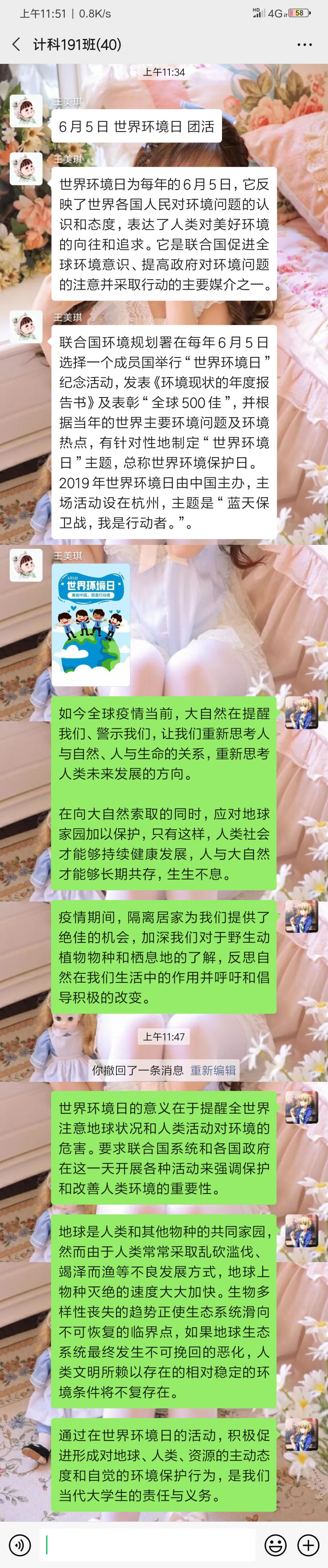 2020年5月31日计科191班由团支书王美琪组织召开世界环境日主题线上团活,计科191班全员参加。