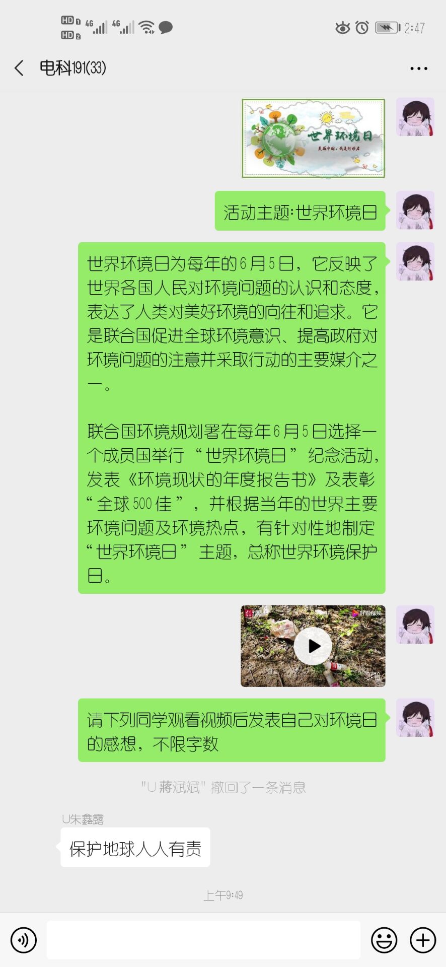 为让同学们知晓保护环境的重要性,关注我们赖以生存的生态系统。2020年6月5日,电科191班通过班级微信群开展“世界环境日”线上主题团活,本次团活由组织委员康佳慧主持,电科191班全体成员参加。