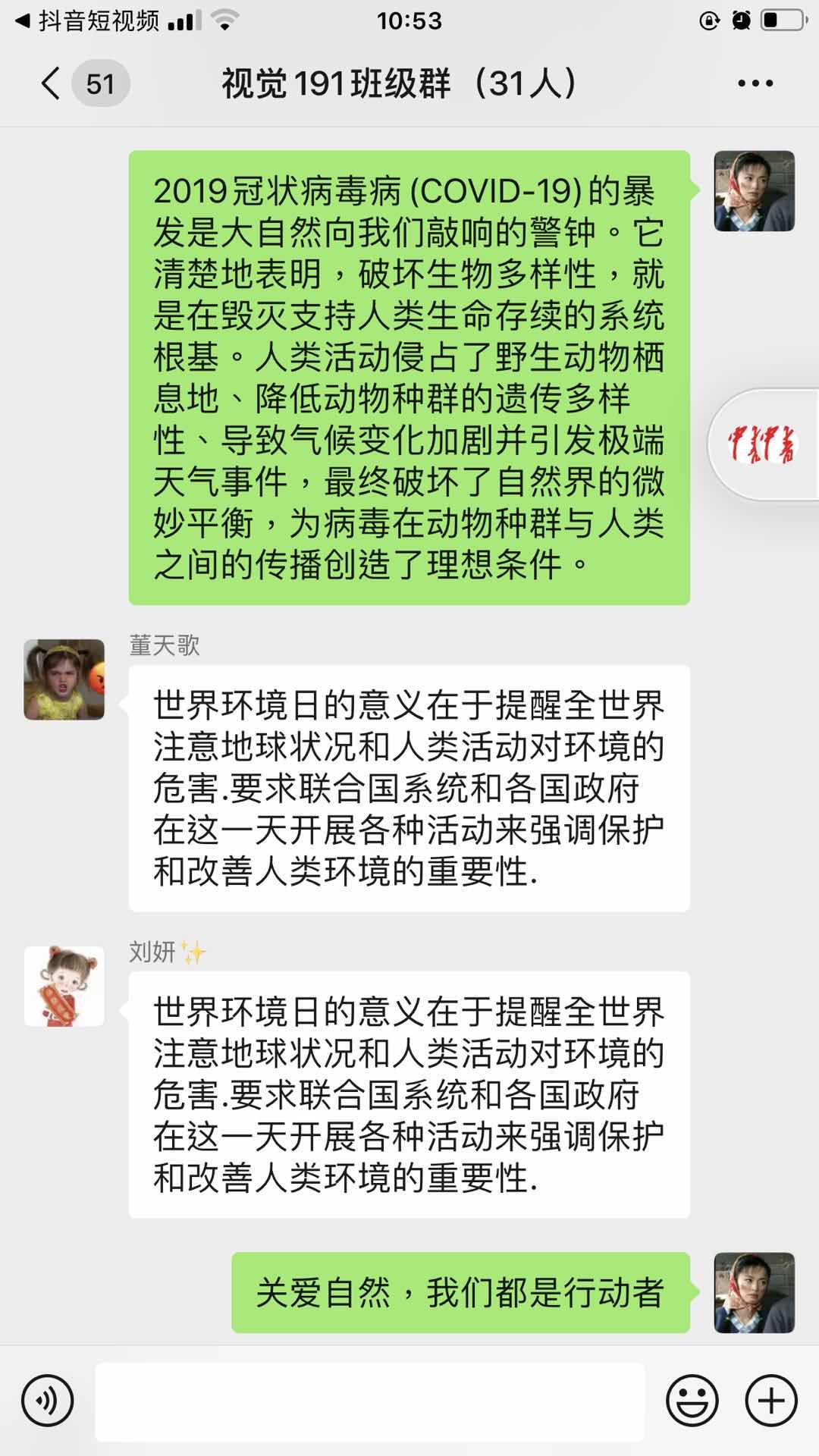 2020年6月5日,视觉191班在组织委员孙慧慧的组织下于线上班级群开展“世界环境日”主题团活。此次活动由孙慧慧主持,视觉191班全体同学参加。