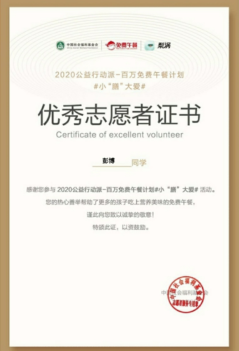 2020年5月23日-5月25日期间,求索文学社联合慈善社团举办“小膳大爱”公益捐赠活动,本次活动是由中国社会福利基金会免费午餐基金联合京东数科旗下梨涡发起的公益活动。